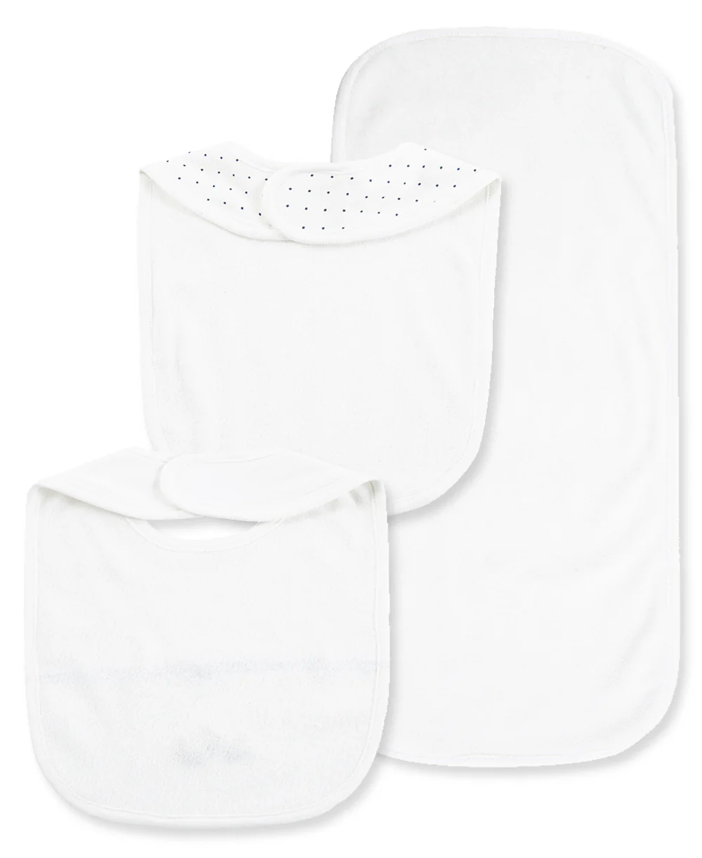 - Set includes 2 coordinating bibs and 1 burp cloth